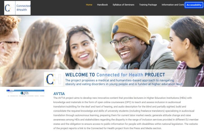 The Connected For Health project has the aim to provide lecturers/ trainers in universities with skills, knowledge, methods and tools to explore and address teaching/training obesity and EDs trough a trans-disciplinary approach, help residents and students consolidate their knowledge and skills in approaching patiences with obesity and eating disorders, support specialists in different medical fields to acquire new trans-disciplinary knowledge and skills to deal with these patiences. The website of the project reports a link to the AVTIA project from the Press and Media section.