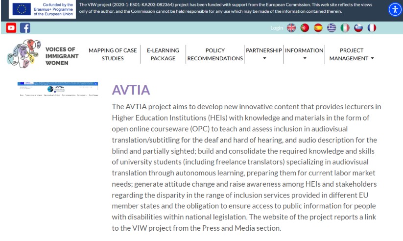 The VIW project aims to answer to the need of students of developing better knowledge and awareness toward the theme of woman migrations considering the interrelation of factors such as: gender, status, ethnicity, age, religion, origin, political opinion. The website of the project reports a link to the AVTIA project from the Press and Media section.