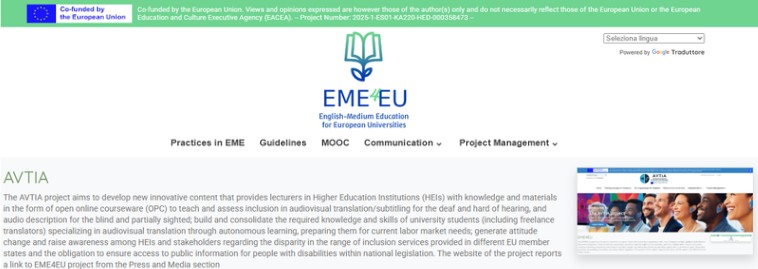 The EME4EU project has the aim to transform European Higher Education by empowering institutions to implement high-quality English Medium Education programs. It aims to enhance universities’ capacities, improve legislative frameworks, and foster collaboration among institutions, creating a globally competitive and inclusive education system. By addressing challenges like language barriers and resource gaps, the project promotes accessibility, innovation, and labor market alignment. The website of the project reports a link to the AVTIA project from the Press and Media section.