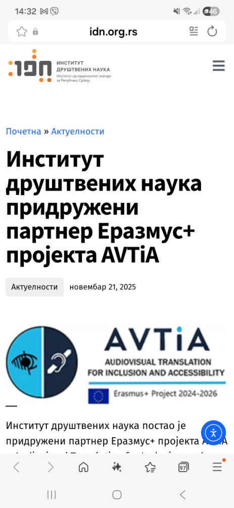 The University of Belgrade is one of six partners in the project AVTiA – Audiovisual Translation for Inclusion and Accessibility (Project Number: 2024-1-RO01-KA220-HED-000249675), which has been implemented since November 2024 within the Erasmus+ programme. The representative of the University of Belgrade in this project is the Faculty of Medicine, and the project also involves the Faculty of Philology, the School of Dental Medicine, and the Faculty of Sport and Physical Education. The project is intended for lecturers and instructors in the field of philology, undergraduate and postgraduate students in (audiovisual) translation, as well as beginner translators seeking a career change or further training in audiovisual translation with the aim of increasing inclusion and accessibility. It also targets decision-makers and policymakers in higher education institutions. The planned project outcomes include the development of a training package for educators, a training package for students, and the creation of policy recommendations governing education in the field of audiovisual translation for inclusion in higher education.