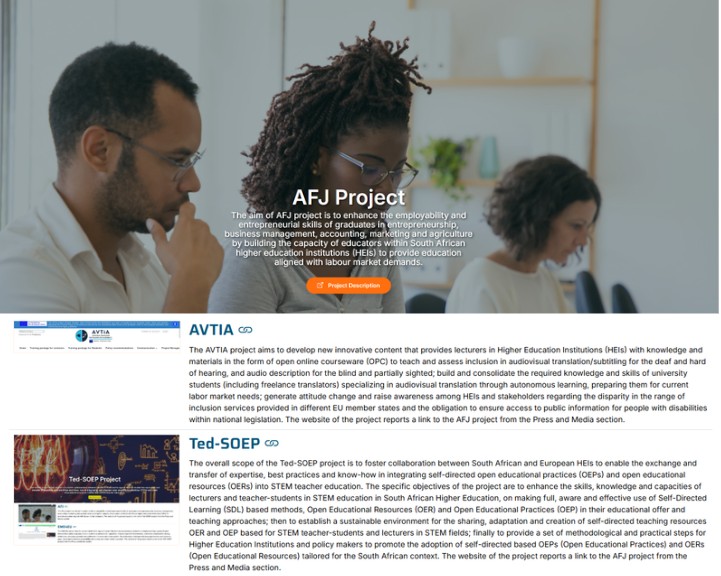The AFJ project has the aim to enhance the employability and entrepreneurial skills of graduates in entrepreneurship, business management, accounting, marketing and agriculture by building the capacity of educators within South African higher education institutions (HEIs) to provide education aligned with labour market demands. The website of the project reports a link to the AVTIA project from the Press and Media section,